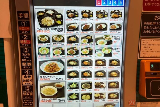 明るい店内を覗くとフードコートがありました。メニューには「ボリューム満点生姜焼き定食」(1000円)や「ジャンボメンチ&コロッケ定食」(1050円)など、トラックドライバーが多く訪れることを考慮してか、ビッグサイズのメニューが多いようです。