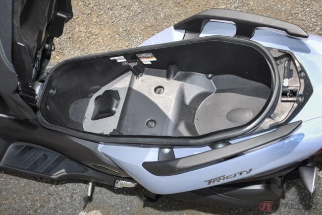 こんなに大きいと、収納もシートもビック! ヘルメットやリュックも入れられそうだし、シートの座面積も広々で、走行時はとても快適そう!