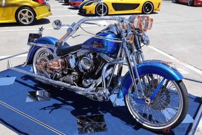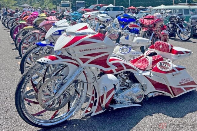 バイクはハーレーダビッドソンを中心に、シボレー製V8エンジンを搭載したボスホスなども登場。年式や車種、カラーリングなど、多種多様、色とりどりのカスタムがズラリと並びます。