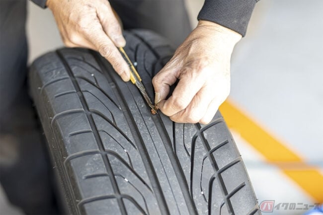 まず簡単なのはトレッドに釘などが刺さった場合、チューブタイヤは自転車と同じ要領でパッチを当てて直します。一方のチューブレスタイヤは接着剤を塗ったゴムを穴に入れて塞ぐことで修理は可能で、どちらも慣れればDIYでも行えます。