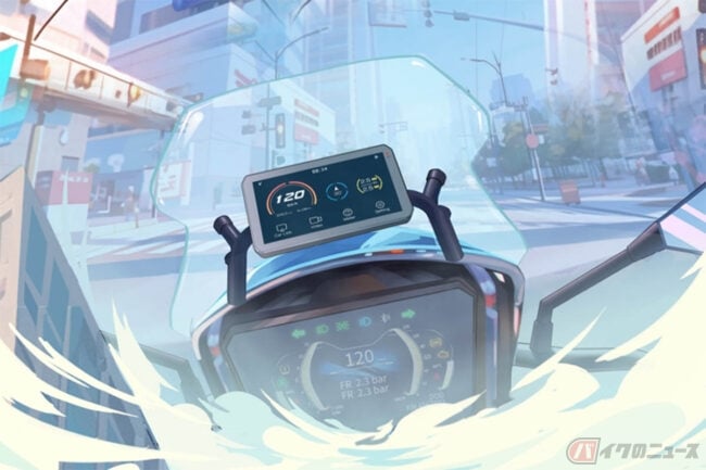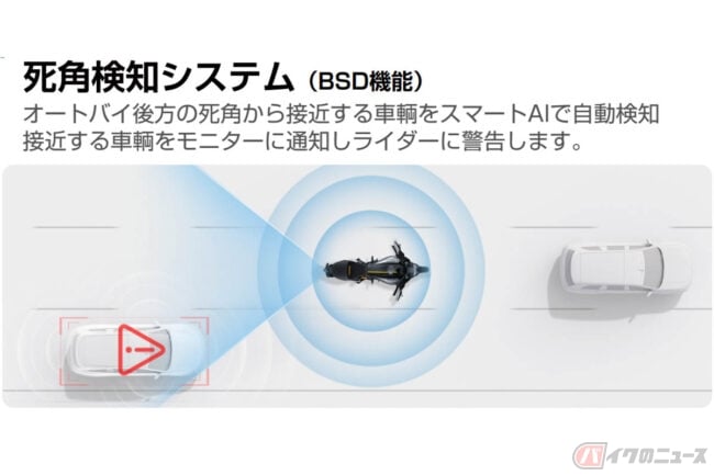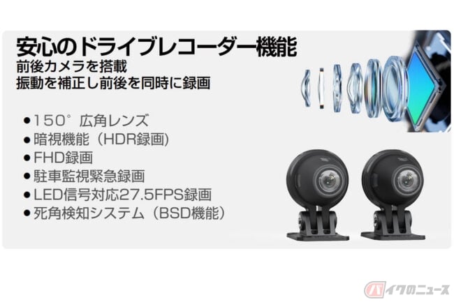 音楽コントロール+ナビ画面を同時に表示できるほか、前後カメラに対応するドライブレコーダー機能、バイク後方の死角から接近する車両をスマートAIで自動検知、警告するBSD機能も搭載されています。