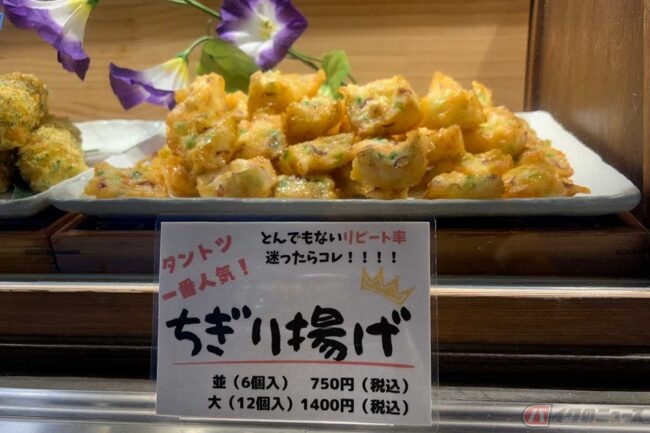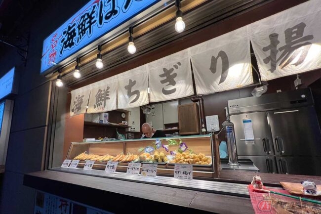 そんなやり取りもあり、まずは静岡ならではの「ご当地メニュー」の文言に惹かれて「たこ焼き 静岡茶とあおさ」(650円)を購入。なにかもう一品欲しいと思い、隣の「海鮮ちぎり揚げ専門店 外花屋」に目を向けると、たこ焼き店の方から「ちぎり上げが美味いから、オススメですよ!」と強く推されました。