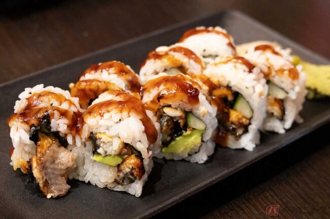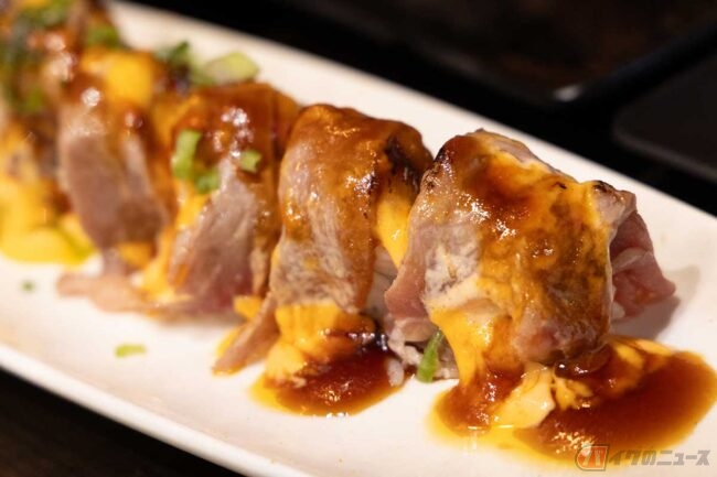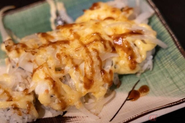などと考えていると料理が続々と出来上がってきました。PHILLY ROLLにJAPANESE LASAGNA……日本では見たこともない創作寿司です。PHILLY ROLLは、一番外側が海苔ではなくご飯、中に海苔、牛肉とキュウリが入っている巻物です。穴子のタレのような甘いソースがかけてあります。JAPANESE LASAGNAは、チーズと玉ねぎ、ホワイトソースっぽい味もします。ドリアの具をご飯に乗せている感じです。