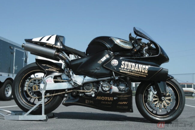 ちなみにサンダンスというショップが、これまでどのような活動をしてきたのか簡単に説明すると1982年に東京の港区で創業(現在の所在地は世田谷区上用賀)し、今年で41周年を迎える老舗H-D専門店で、’88年からレース活動を開始。‘91年から米国、フロリダ州のデイトナで開催される『バトル・オブ・ツイン(BOTT)』(2気筒のバイクのみで争われるロードレース)への参戦を開始し、’97年にBOTT-F2クラス、‘98年には最高峰のF-1クラスで優勝。その後も多くの優勝や記録を打ち立てました。