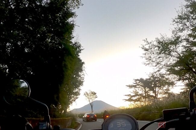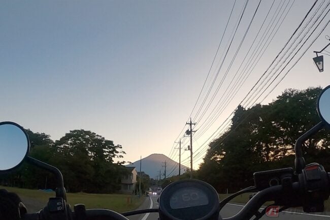この頃には西日が差しており、富士山がくっきりシルエットのようになっていて空とのコントラストが素敵でした。周りの山は黄色の西日に照らされキラキラした木々が見えてバイクに乗りながら思わずうっとり… ふぅー、ここまで運転したかいがあります!(笑)