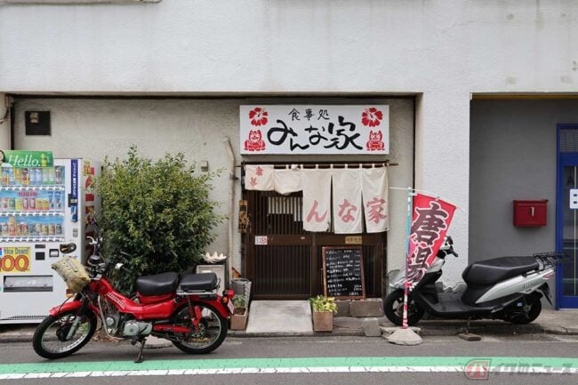 美味しいアジフライを求めて、筆者(増井貴光)が愛車のホンダ「CT110」で走ってきたのは、神奈川県横須賀市です。横浜方面から「ドブ板通り」や米海軍横須賀基地を通り過ぎ、国道16号と並行する「よこすか海岸通り」の間の、日の出町にある目的の店に到着です。以前取材で訪れた、横須賀魚市場にある「新安浦港鮮魚直売所」の方に教えていただいた「食事処 みんな家」です。ご主人の外間さんが釣ってきたアジがいただけるとのこと。