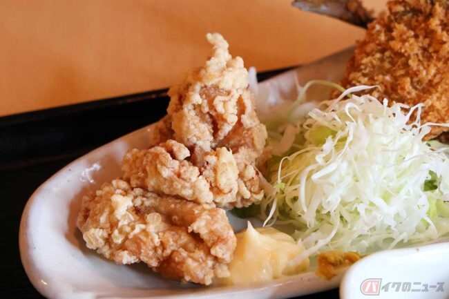 そして「釣あじフライ・鳥唐揚」定食が出来上がってきました。ワンプレートにアジフライ、唐揚げ、キャベツが乗っています。アジは中サイズが3尾、釣ったアジなので日によってサイズや数が違うそうです。