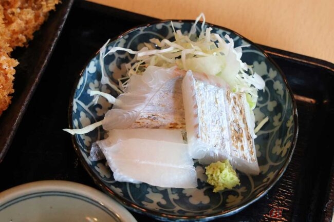 そしてこの日の小鉢はゴーヤの酢の物。ご飯とみそ汁で定食になります。他のお客さんがオーダーした「釣あじフライ・刺身」も見せていただきましたが、新鮮な太刀魚が美味しそうでした。