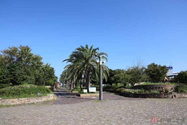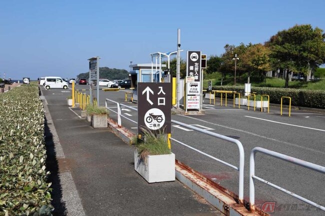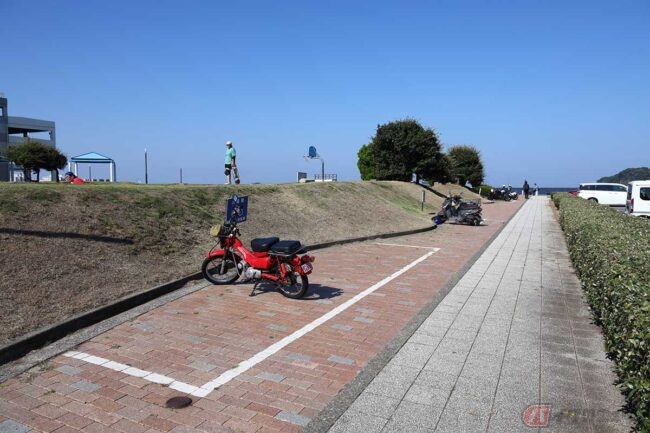 店を後にして、よこすか海岸通り沿いの「うみかぜ公園」に寄り道します。駐車場入り口には2輪車の表示もあり、入って駐輪場にバイクを停めます。駐輪場の西側にはスケートボードやBMXパーク、バスケットコートなどがあります。