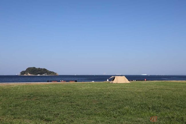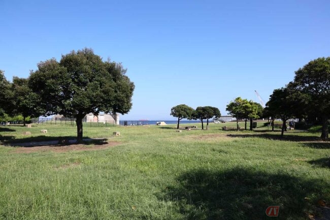 公園の入り口から海を目指して歩いて行くと、気持ちの良い芝生の広場に出ました。ここではデイキャンプやバーベキューが楽しめます。4月下旬から10月末までは、食材の予約販売や用品のレンタルもあり、手ぶらでバーベキューもできるそうです。