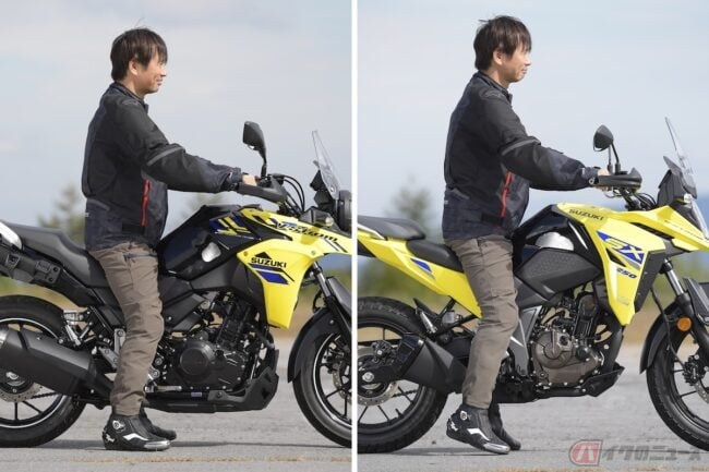 シート高は『Vストローム250SX』が835mm、『Vストローム250』は800mm。身長175cm/体重65kgの筆者がまたがると、写真の通りSXでは両足を地面に下ろすとカカトが浮きます。