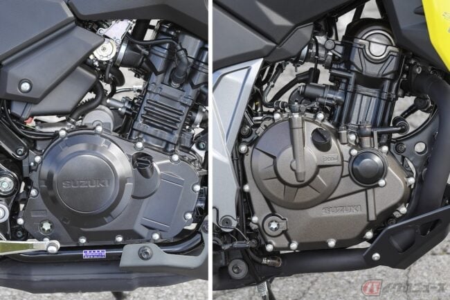 『Vストローム250』の心臓部は並列2気筒エンジンで、『Vストローム250SX』の単気筒に比べると回転変動が小さく滑らかなので、長距離のライディングでも疲れにくい特性と言えます。