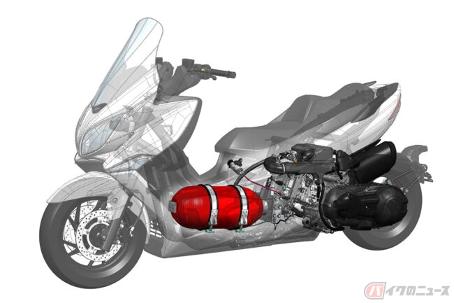 同社がカーボンニュートラルの実現に向けたマルチパスウェイでの取り組みのひとつとしておこなっている水素エンジンの研究開発。それらの研究成果として、市販モデルの「バ―グマン 400ABS」に70MPaの水素タンクと水素エンジンを搭載した試験車両のカットモデルが展示されます。
