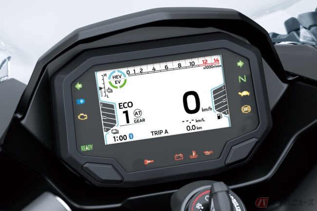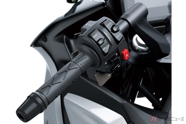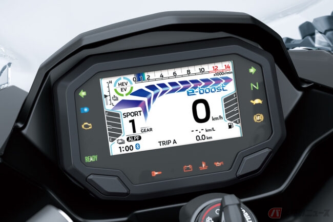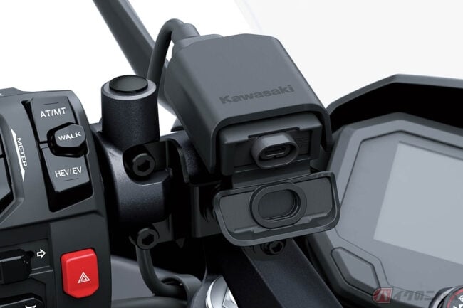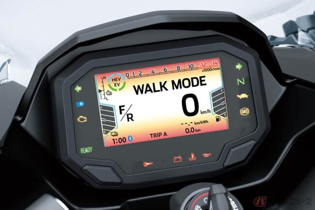 また、Ninja 7 Hybridでは燃料の節約と排出ガスの低減を図るため、停止時に内燃エンジンが停止するアイドリングストップや、停止時に自動的に1速ギアを選択するALPF(オートマチック・ローンチ・ポジション・ファインダー)、低速での操作や駐車をサポートする前後進の「ウォークモード」なども採用。