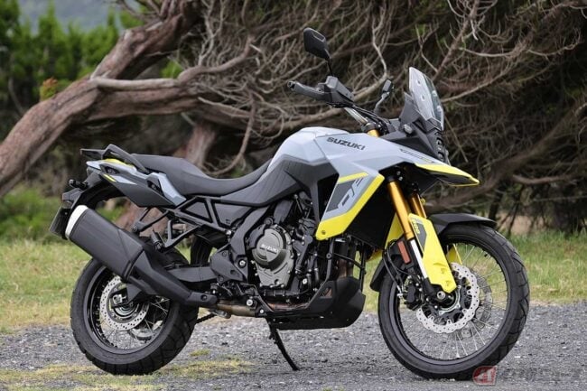 たとえばスズキ「Vストローム800DE」は、基本的にエンジンやメインフレームはロードスポーツの「GSX-8S」と共通ですが、「舵取り角左右」は「Vストローム800DE」が40°で、「GSX-8S」の35°よりもかなり大きくハンドルを切ることができます。