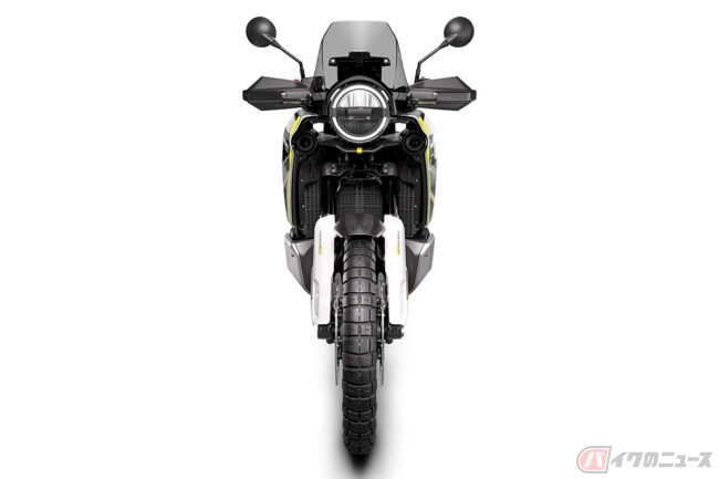 多くのアドベンチャーモデルと同様に、旅に必要な荷物の積載力とともに長距離を快適に移動し、舗装路のみならずオフロードも走破する、というコンセプトに基づき、走破性能はもとより、スリムな形状のフロントカウルと一体化した大径丸型LEDヘッドライト、カウルの内側に装備されたフォグランプなど独特の車体デザインとすることで、ハスクバーナらしい個性的が演出されています。