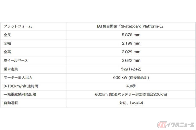 IATは世界の自動車メーカーの要望に応えるEVプラットフォームを、大型から超小型まで複数有。そのなかでもT-MADは大型EVプラットフォームに合計600kWの高出力モーターをフロントとリアに1基ずつ搭載するモデルで、1充電あたりの航続距離は600kmですが、拡張バッテリーを追加すれば800kmの走行が可能です。