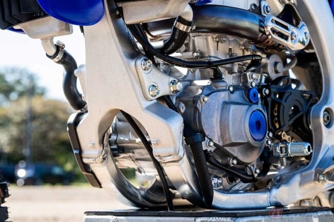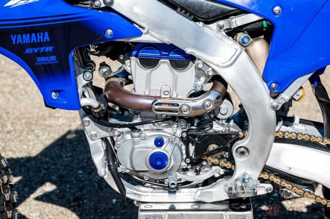 エンジン設計を担当した小野寺正洋さん(YZ250F EG設計プロジェクトチーフ)によると、高回転耐屈曲性や疲労強度を上げた新作カムチェーンを採用し、フリクションを低減。チェーンは従来モデル比で1.95mm幅が広く、噛み合い時の面圧を減らすことで耐硬直性を向上しているとのこと。