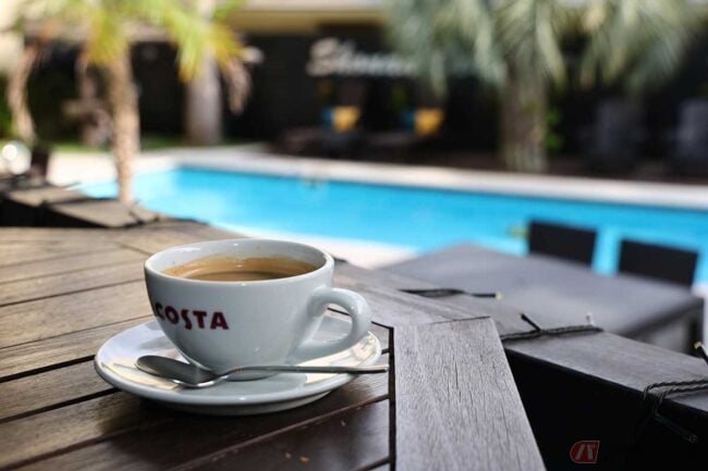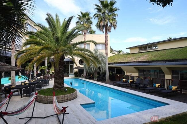 エントランスにバイクを停めてレストランへ向かいます。この日は天気も良かったので、店内ではなくテラス席に座ります。すぐ目の前には椰子の木とプールがあって、ハワイ風リゾート感たっぷりです。