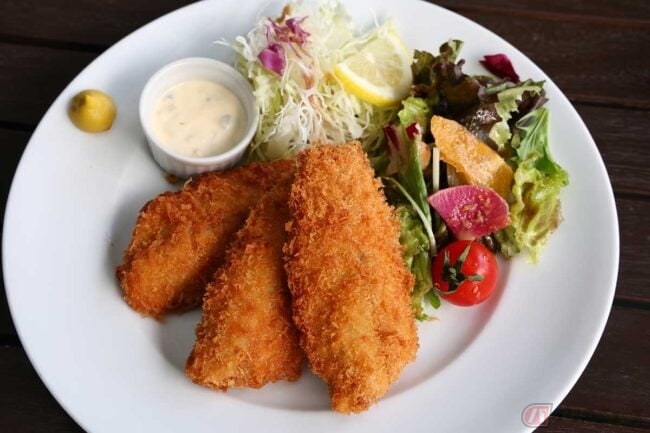 リゾートな景色をぼーっと眺めながら待つこと10分ほどで「アジフライ御膳」が出来上がってきました。御膳なので和風な盛り付けかと思っていましたが、彩りの綺麗なサラダが盛られていてリゾートな景色に合っています。