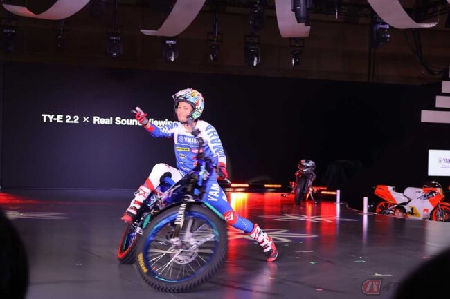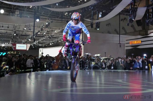 『ジャパンモビリティショー2023』のプレスデー(10月25日)に行なわれたヤマハのプレスブリーフィングは、ライダーが操るバイクが中央ステージに登場する演出から始まりました。ステージを囲む報道陣たちの手前でブレーキングしたかと思えば、ステージ奥に設置されたセットを駆け上がる──。トライアルライダー黒山健一選手とヤマハの電動トライアルマシン「TY-E 2.2」によるデモンストレーションです。人馬一体となってひらひらと「TY-E 2.2」を走らせる黒山選手のパフォーマンスに、バックミュージックが響きます。東京ビッグサイトという屋内で披露されたそれは、間違いなく電動トライアル車ならではのパフォーマンスでした