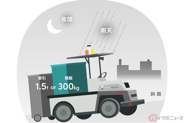 eve autoは、高い信頼性により全国で活用されているEVカートと、公道においても活用される最先端の自動運転技術を活用し、雨天や夜間でも物流施設等の敷地内屋外環境で自動運転レベル4での無人搬送運用を実現しているため、24時間稼働が求められる施設での運用も可能。