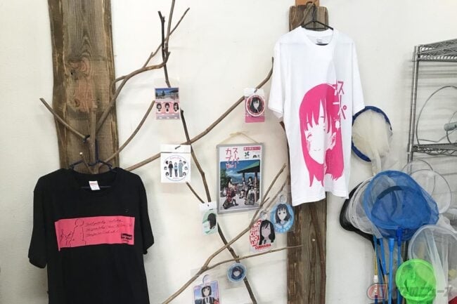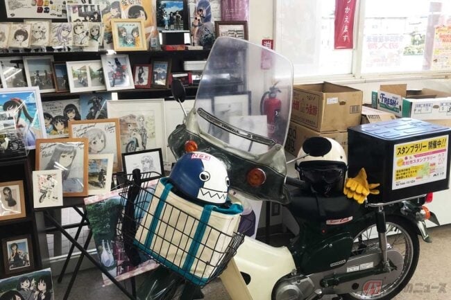 レジ周辺にには、スーパーカブ関連グッズが置かれており、店内の一角には小熊役の夜道 雪さん(バイクのニュースでも大人気!)が訪れた際に店内で撮影した生写真や直筆メッセージをはじめ、イラスト、写真などが所狭しとディスプレイされています。
