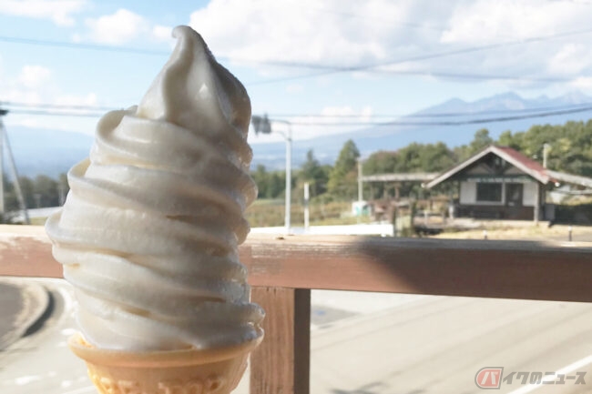 筆者がいただいたソフトクリーム(350円)は、さっぱり系ながらソフトキャンディーのミルキーを思わせるような味わい。眼前に広がる山々を眺めながら堪能するソフトクリームは絶品でした。