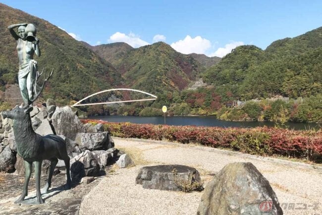 施設内の芝生広場からみずがき湖越しに鹿鳴峡大橋を望む景色は、描き下ろし新イラストの背景になっているので、同じ構図で写真を撮ってみるのも一興。3人組でピクニックをすれば、作品の世界観により浸れること間違いナシです。