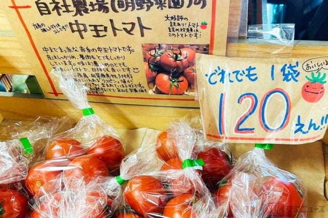 なお、「訳あり!! トマト詰め放題」は主に毎週土曜日の開催(それ以外の曜日は中玉トマト袋詰め120円を販売)。「トマトピザトースト」はトマトが必要なだけある時、またはソースが作れた時のみの提供となっています。