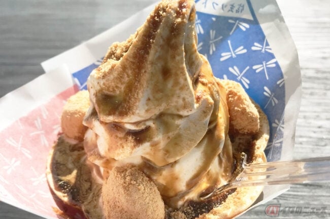 バニラアイスと黒蜜が奏でる濃厚なハーモニー、香ばしいきな粉がまぶされた餅の食感が、まるで鯉のぼりの鯉のごとく、口にした者を昇天(?)させてくれます!