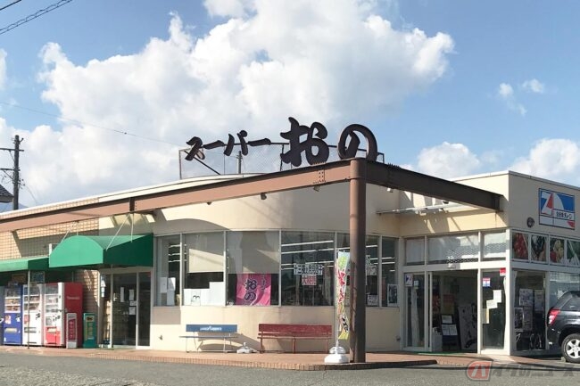 筆者が訪れたのは「スーパーおの」。アニメ第3話「もらったもの」でリアキャリアに付ける箱を信用金庫のオジさんの所へもらいに行く際、訪問前に小熊と礼子がお土産の菓子類を買うために立ち寄った地域密着型スーパーです。