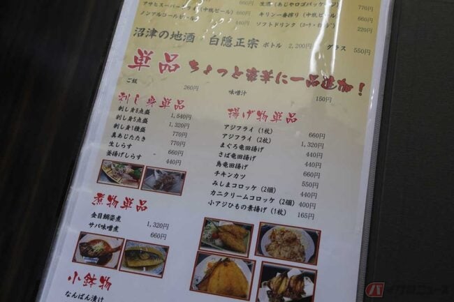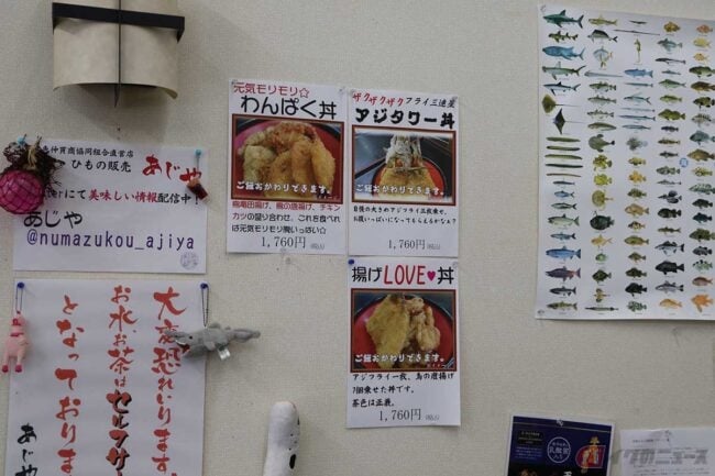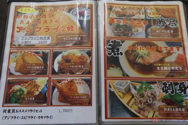 既に空腹の筆者は店内へ。壁には「当店自慢のでっかいアジフライ」というメニューが貼られています。これは期待「大」ですが、落ち着いて他のメニューも見ることにします。まず視界に飛び込んできたのは「オススメあじや自慢のふわふわ肉厚ちょっと大きめアジフライ2枚」や「当店仕込み、こだわりのアジフライをご賞味あれ」という文言、もうこの原稿を書く必要は無いんじゃないかと思うほどのキャッチが書かれた「アジフライ定食」です。