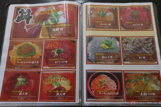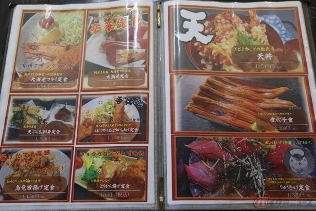 やはりこれ以外の選択肢は無いと確信しつつ、さらにメニューを見てみます。「フライ三種盛定食」に「アジ・大海老フライ定食」、「あじづくし定食」と、自慢のアジフライが含まれる定食が並んでいます。正直言って「あじづくし定食」も魅力的です。海鮮丼、マグロ丼も美味しそうです。しかしミッションを遂行すべく「アジフライ定食」をオーダーします。