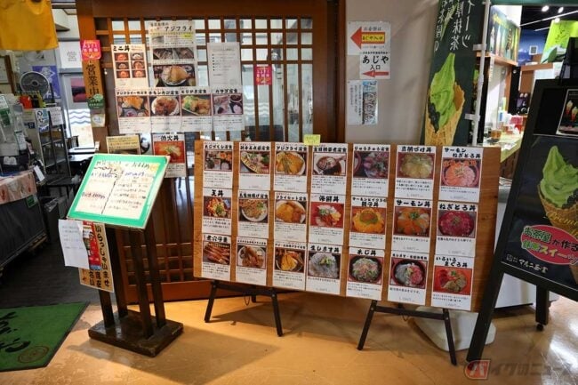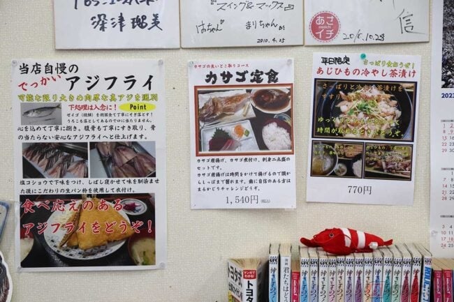 いきなり「しーらかんすCafe」とインパクトのある店がありますが、寄り道せずに「あじや」へ。店の前にはサバの味噌煮や真鯛かぶと煮などがパックで販売されています。これもなかなか美味しそうです。扉の前には写真で食事メニューが並んでいて、海鮮丼や刺身が見るからに美味しそうです。