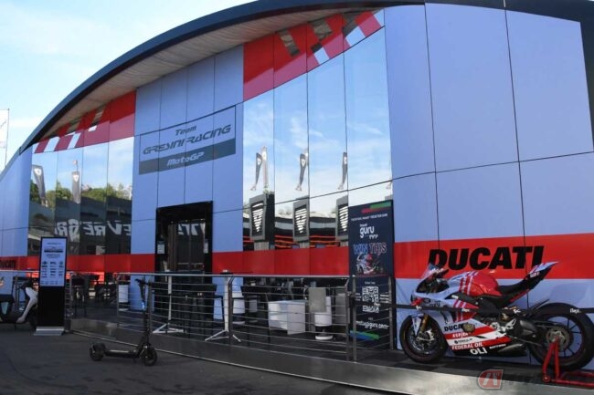 ドゥカティのサテライトチーム、グレシーニ・レーシングMotoGPのホスピタリティは、一部が鏡張りですね。ホスピタリティの前にバイクを展示しているのも、よくある光景です。