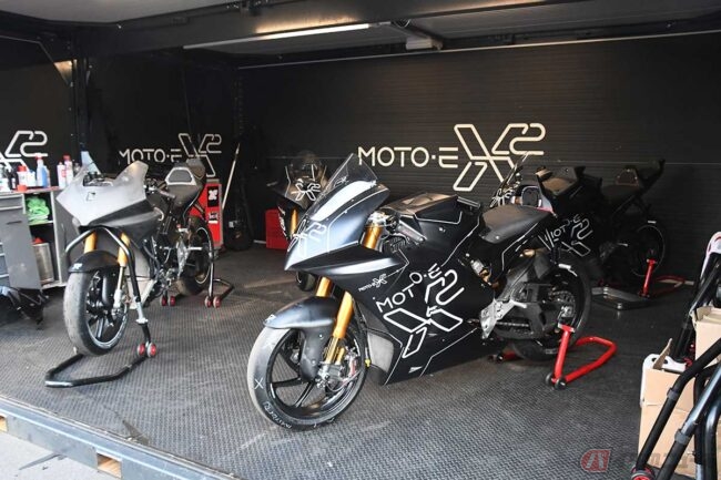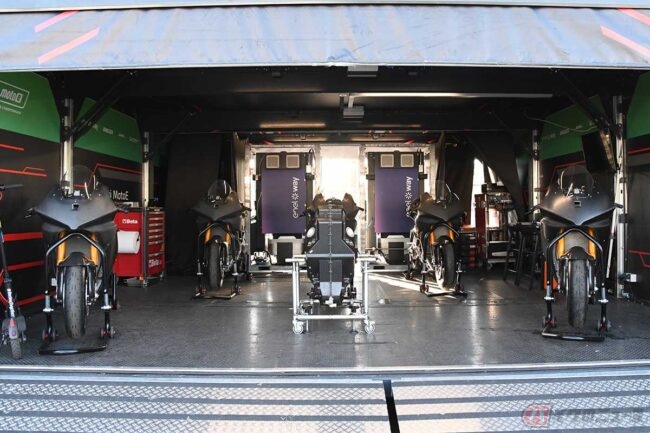 電動バイクレース『FIM Enel MotoE World Championship』が開催されるグランプリでは、パドックの中に「Eパドック」というエリアが出現します。MotoEのピットだけが集められたエリアです。この場所で、電動バイクの整備やセッティング、充電、ときにはライダーとメカニックとのミーティングなども行なわれています。