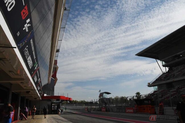 MotoGPカタルーニャGPの開催地、バルセロナ・カタルーニャ・サーキットのパドックをぶらぶらと歩きます。ヨーロッパで開催されるグランプリでは、各チームのトレーラーや移動式ホスピタリティがびっしりと立ち並ぶのが特徴です。ヨーロッパは陸続きなので、レースの度にこれらのトレーラーたちが移動していくわけです。例えば日本GPにやってくるためには海を越えなければならないので、こうしたトレーラー群は、ヨーロッパグランプリならではの光景です。