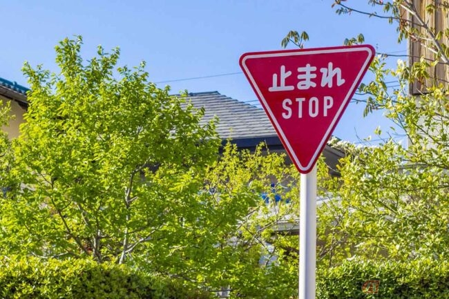 いわずもがな、一時停止の標識です。必ず止まって安全確認しましょう!