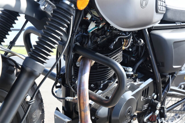 一方のフロントサスは外見からはスプリングもなければ、筒も見当たりません。しかし、実際はキチンとフロントフォークの中に内蔵されています。そんなフロントフォークは二分割になっていて、メッキされたシャフトが内側から伸び縮みするのはそのためです。