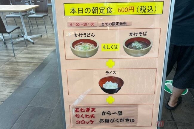 全国各所にある高速道路のSA(サービスエリア)やPA(パーキングエリア)のフードコートには、朝食メニューが用意されていることが多くあります。朝食ゆえにシンプルなものが多く、東関道「酒々井PA」(下り)では温かいかけそばのセットをいただきました。