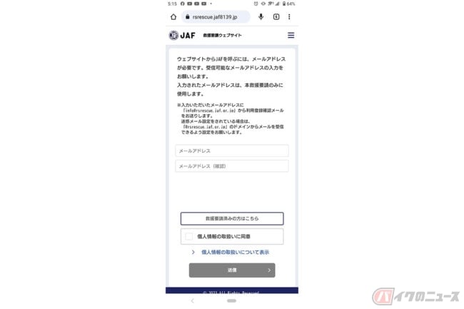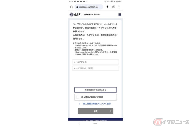 専用サイトからメールアドレスを入力し、受信したメールに記載されているURLをタップするとトラブル内容や救援場所を入力するページに遷移され、必要事項を入力するだけでかんたんにJAFを要請することができます。