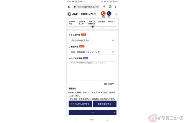 4, 表示された入力フォームに従い、救援場所やトラブル内容を選択