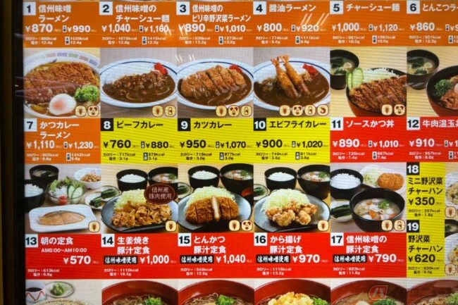 フードコートの券売機を見るとカツ系メニューが充実しており、「かつカレーラーメン」、「カツカレー」、「ソースかつ丼」なども並びます。信州味噌を使ったラーメンも各種あり、まだまだ気になるメニューが多いと感じる「諏訪湖SA」(上り)でした。