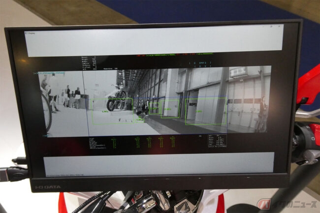 カメラからの画像をAIで処理し、人やクルマ、バイクも認識できているなど、会場では実際の解析状況をモニターで見ることができました。