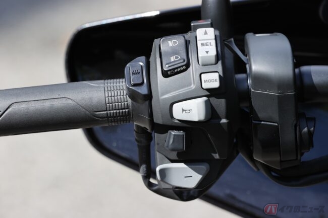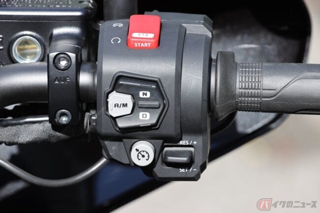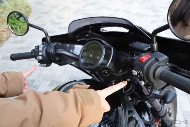 ハンドルを左右に振ってみて、重みは感じるものの取り回しづらそうなイヤな感じはなかったな。車重248kgあるけど、コンパクトに造られているからか、女性でも余裕で押し歩きできるよ。安心してね。