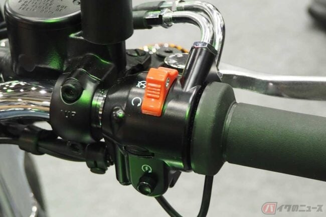 エンジンの始動はキックスターター、もしくは“押しがけ”で、セルフスターターも装備していません。レース専用なのでイグニッションキーもありません。そして走り終わったらエンジンを止める必要があるので「キルスイッチ」が装備されたのです。