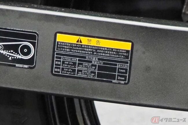 空気圧はバイクによって異なるので、そのバイクの指定空気圧に合わせることが大事です。多くのバイクはスイングアームやチェーンケースに貼られたステッカーに指定空気圧を表示しています。もしステッカーが見当たらなければバイクの取扱説明書(ハンドブック)に記載がありますし、バイクメーカーの「お客様相談室」に聞くのもアリでしょう。