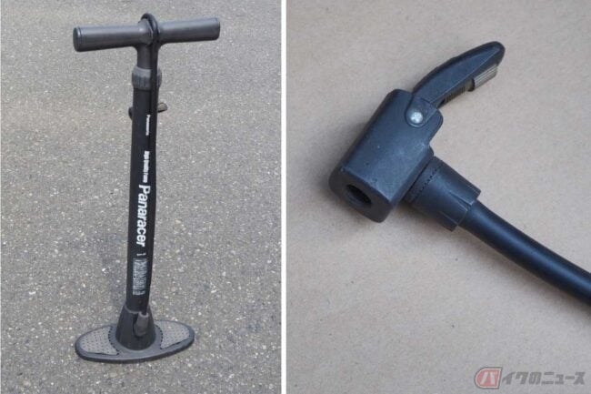 空気圧をチェックして、もし指定空気圧より低かったら空気を入れますが、自転車用の空気ポンプが使えます。バイクのタイヤは自転車より太いので(とくに後輪)、まずは頑張って30回くらいポンピングして、再度空気圧をチェックしましょう。