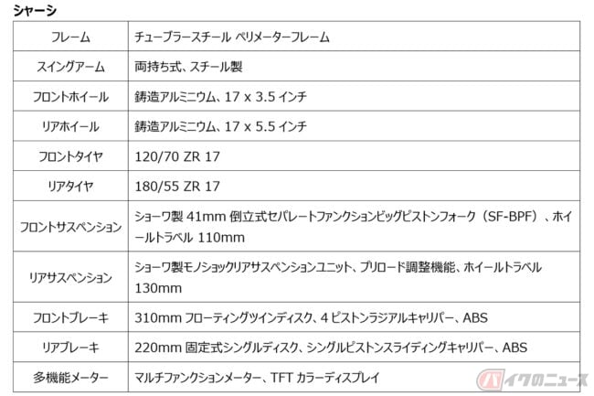 310mmツインディスクとメッシュホースのブレーキラインを備えたラジアル4ピストンブレーキ、ミシュランの最新タイヤ「Power 6」も備えられています。